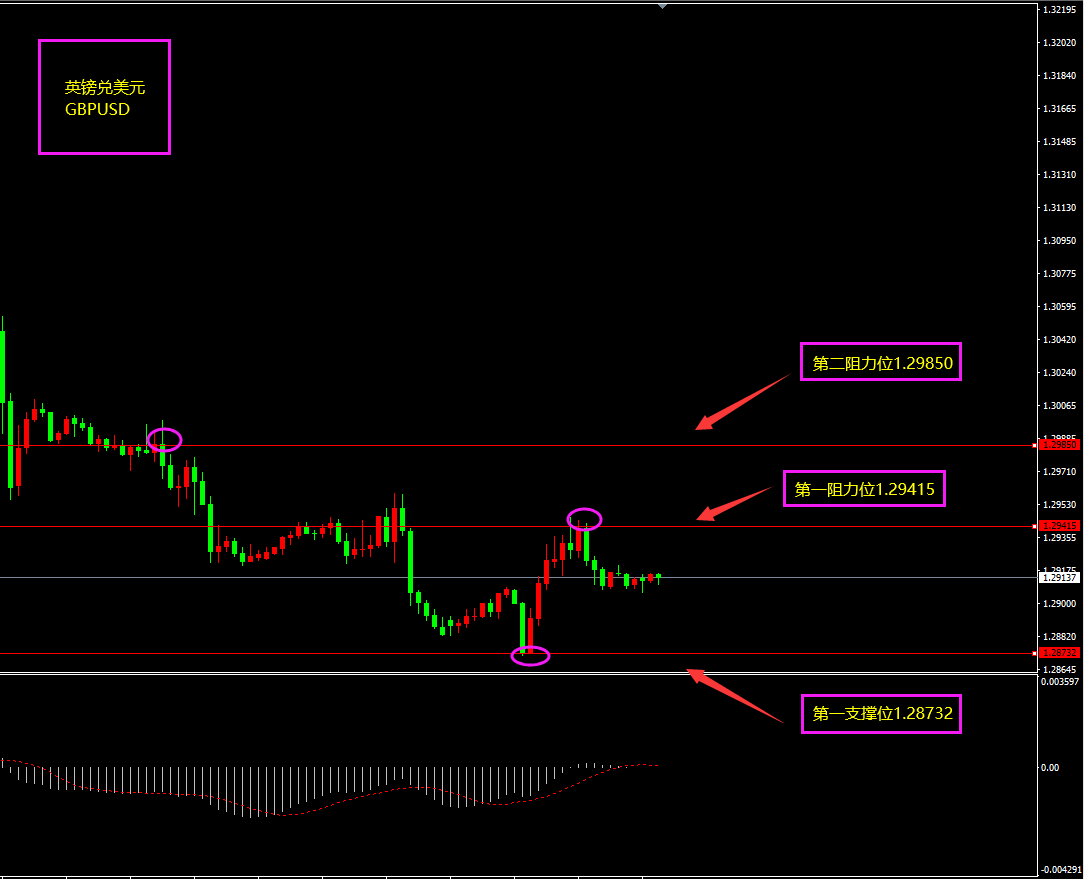 技术点评:天图欧元连续6连阴,走势跌至前期低点附近,因昨日晚间美指走强对欧元再次形成打压,日内欧元有望触底形成反弹,天图阳线不出多单不入。小时图欧元底部MACD形成底背离之后,存在大阴线创新低,形态失效,短期空头走势有所放缓,需等底部出现大阳线,大阳线一出,日内方可看多,谨记。