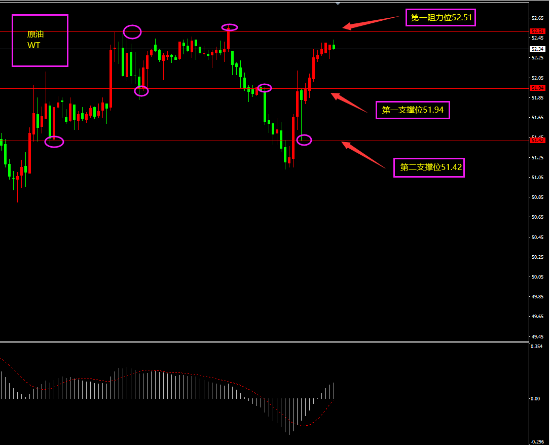 技术点评:天图原油收长下影线,多空争夺相对激烈,短期MACD仍位于0轴之下,空头仍在,但MACD逐渐上移,进入修复期,日内更多在低位震荡为主。小时图原油价格走出“过山车”行情,行情快速下跌之后又快速反弹上来,目前仍处在高位震荡区间,区间不破,方向不变,日内以震荡为主。