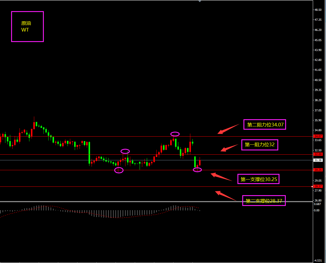 趋势分析:原油暴跌以来,短期在低位震荡,区间不破,方向不变。